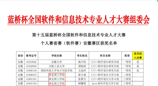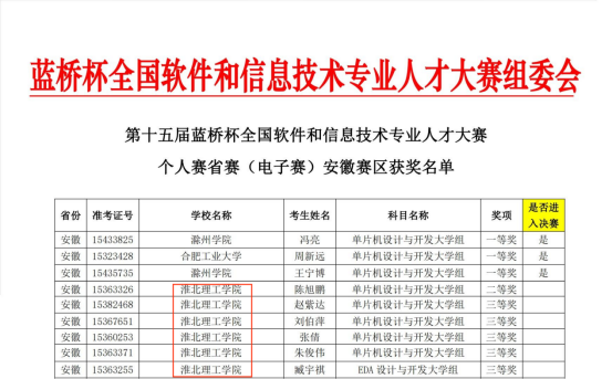 近日,第十五届蓝桥杯全国软件和信息技术专业人才大赛个人赛省赛安徽赛区圆满落幕。8858cc永利首次组织并筛选出17位学子参赛。其中4位参加软件赛的学子荣获省级大学B组二等奖1项和省级大学B组三等奖2项,13位参加电子赛的学子荣获省级大学生组二等奖1项和省级大学组三等奖5项。部分获奖名单如图所示: