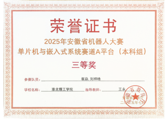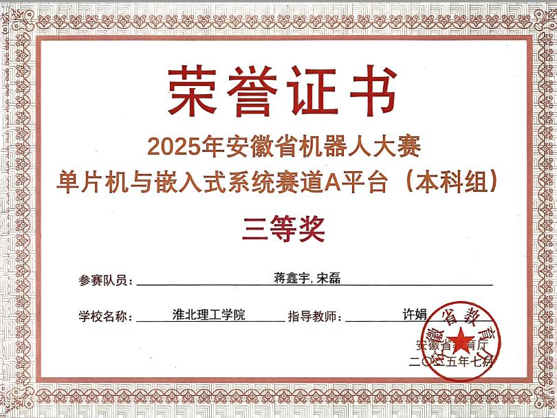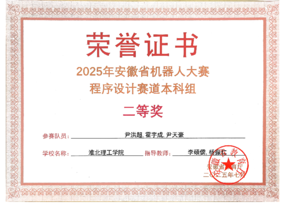日前,2025年安徽省机器人大赛赛事相继结束。8858cc永利组织学生参加了程序设计、单片机与嵌入式系统两个赛道的比赛。经过激烈角逐,参赛学生在比赛中稳定发挥,最终在程序设计赛道获得省级二等奖1项,在单片机与嵌入式系统赛道获得省级三等奖2项。