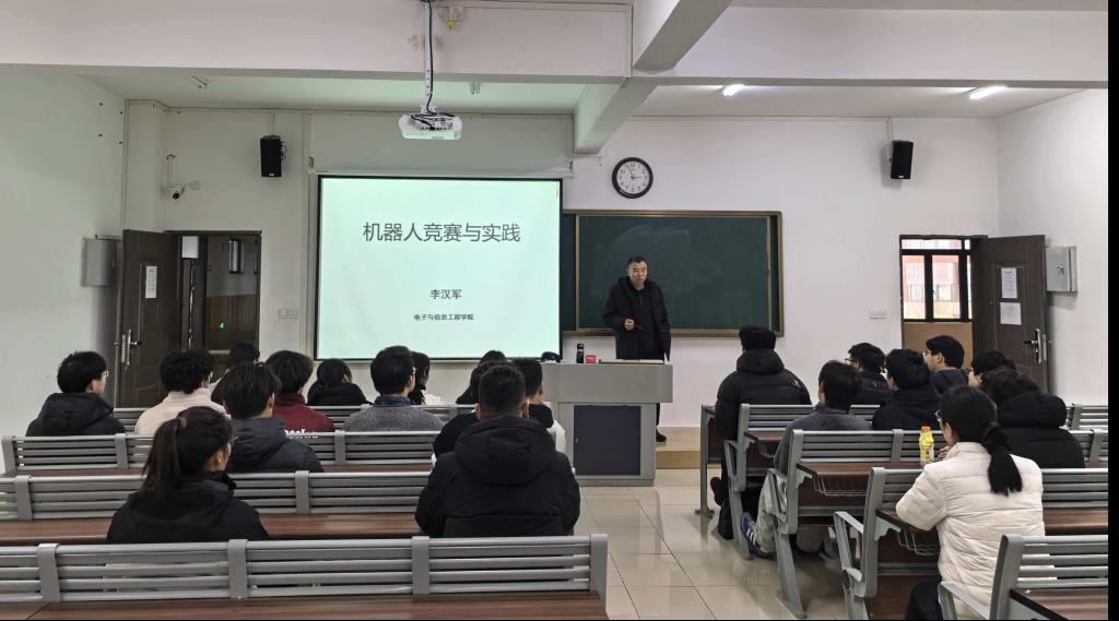 培训伊始,李汉军教授“从大学生视角看机器人竞赛”为切入点,结合机器人发展历程与当下主流竞赛趋势,简明梳理了人形机器人竞赛的核心考察方向与备赛重点。针对竞赛中蛙跳竞步、竞技体操、分拣搬运、仿人搏击等赛道,李教授拆解了关键技术难点,分享了实操调试技巧与赛场应对策略,让学生快速了解竞赛核心要点。同时,李教授结合自身指导经验,针对备赛过程中组件加工、编程调试、场地测试等环节易遇的问题,给出了切实可行的解决办法。